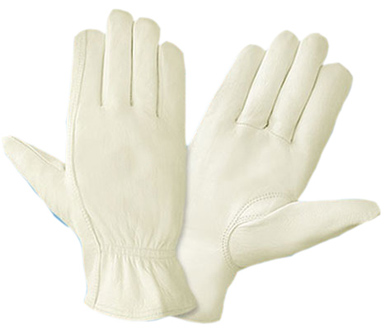 UNLINED CHROME COLOUR COW SPLIT LEATHER DRIVER GLOVE, KEYSTONE THUMB, SHIRRED ELASTIC ON WRIST, COTTON HEMMING. SIZES S, M, L, XL, XXL.